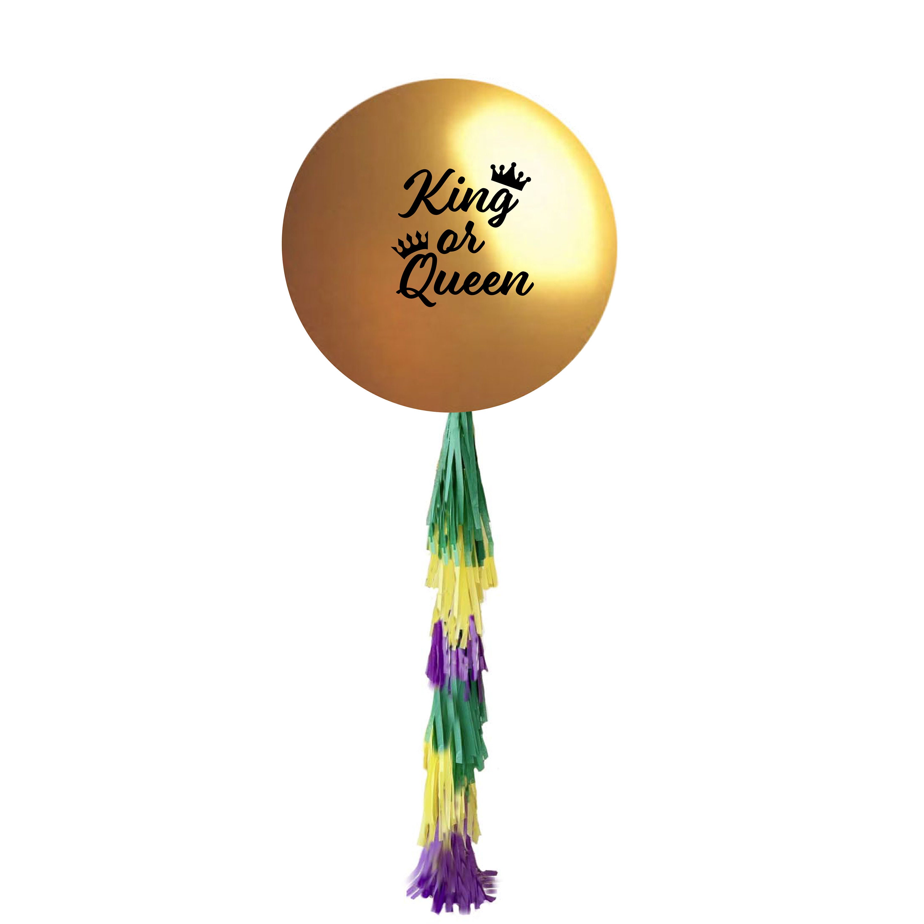 King or Queen Mardi Gras black or gold 36" gender reveal balloon with a custom King or Queen Sticker and yellow, green and purple tassels and confetti! The perfect Mardi Gras ⚜️ gender reveal balloon and decor!