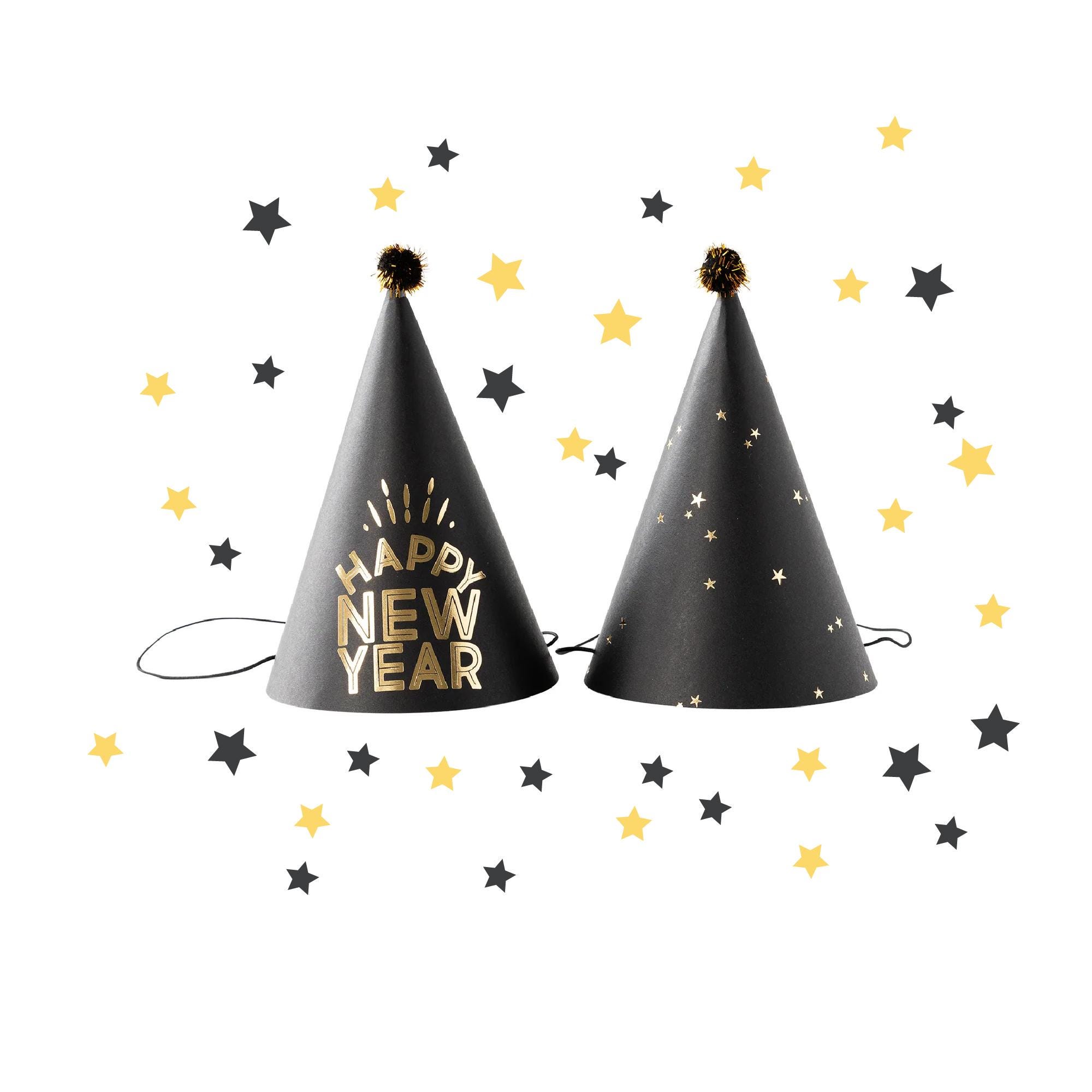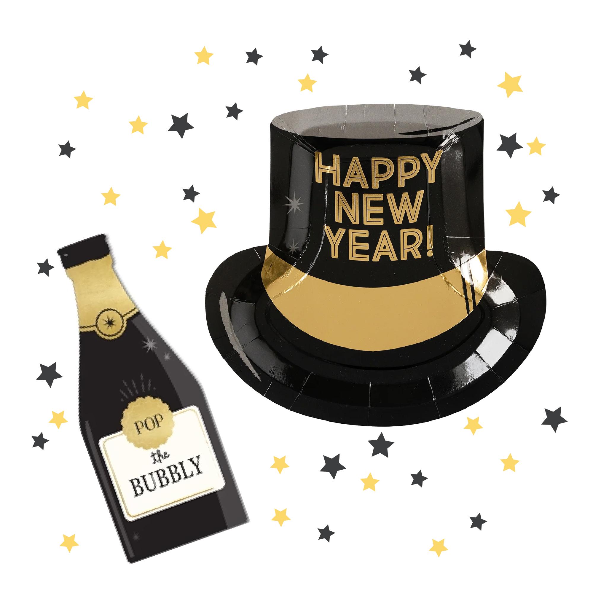 New Year's Eve Party Paper Plates and Napkins 2026. 8 - 10" Top Hat paper plates with metallic gold accent and 32 - 3.5 x 7.25 paper napkins with metallic gold accents. Perfect for your New Year's Eve bash! These would be great for a wedding too.