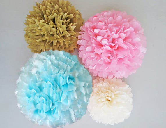 These tissue poms are perfect for a gender reveal, baby shower or birthday or any party! Hot pink, gold, royal blue and ivory are beautiful together! A show stopper at any special occasion!