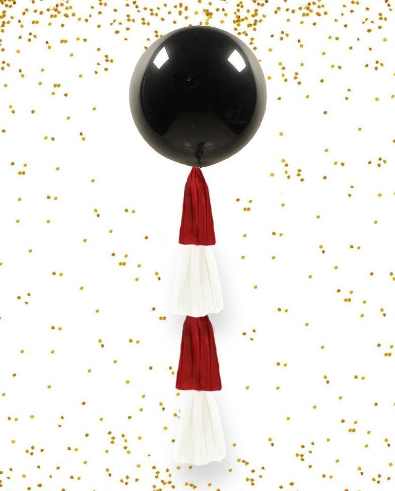 Ready to ship! A gold or black 36" gender reveal balloon with red & white tassels! The perfect reveal balloon and decor!