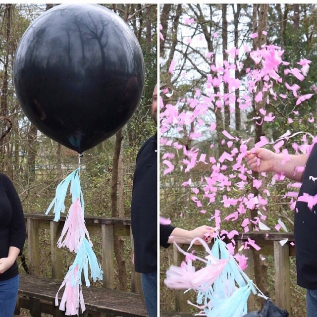 A gorgeous giant balloon sent with tassels and BOTH COLORS OF CONFETTI (or pre-filled-just let us know, choose option 3 or 4) for a gender reveal party or any special occasion!