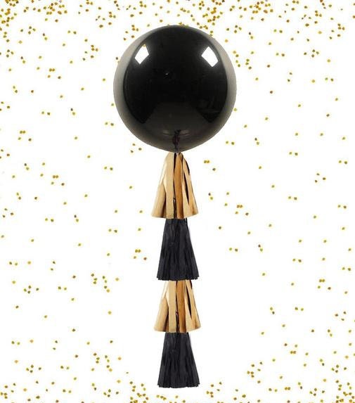 A black 36" Gender reveal balloon with gold & black tassels! The perfect gender reveal balloon and decor!
