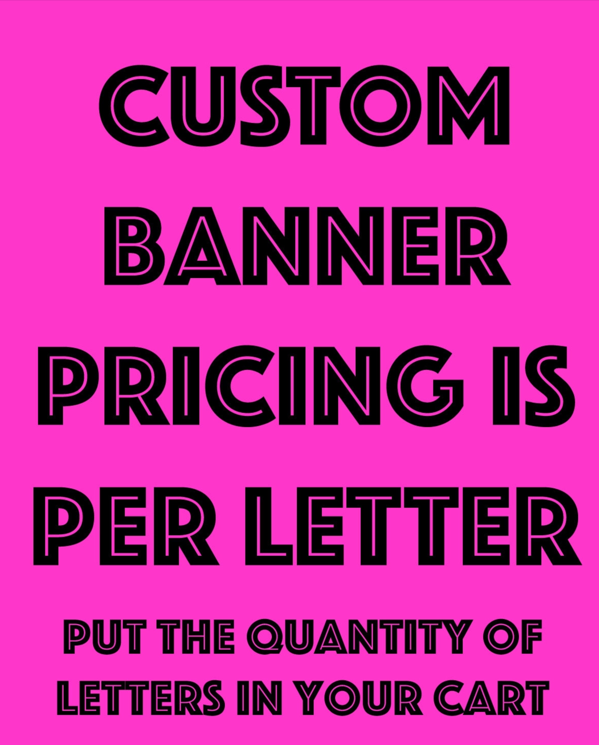 Custom banners are $2.95 per letter. Please make sure you have the correct quantity of letters in the quantity pull down. Then put your phrase in the notes to seller at check out.